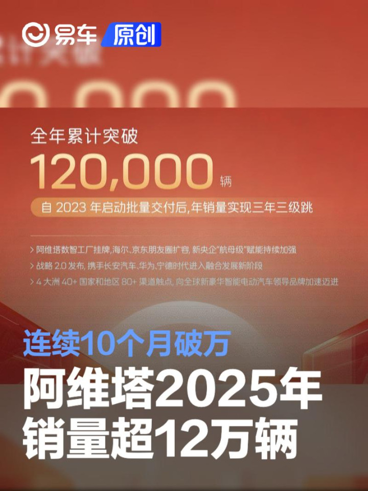 易车讯1月1日,阿维塔科技公布最新销量数据。2025年12月,阿维塔科技销量10470辆,连续10个月销量破万;全年累计销量突破12万辆,自2023年启动批量交付后,销量连续迅猛增长,三年实现三级跳。